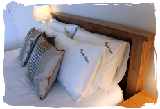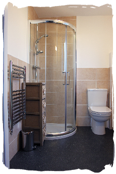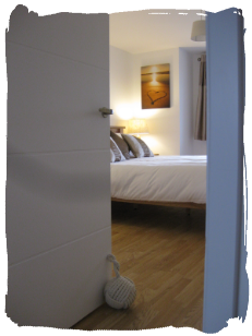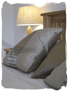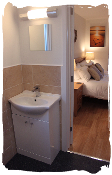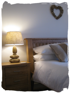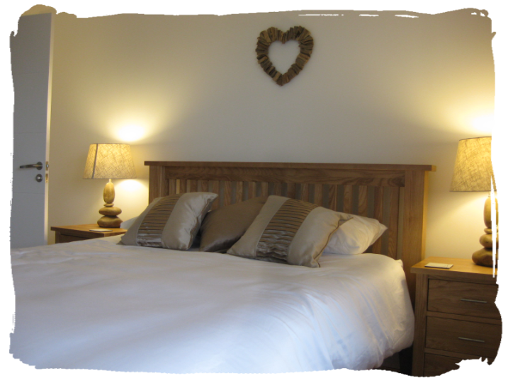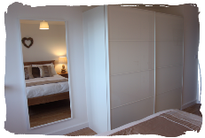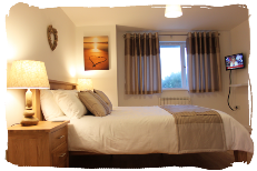 The master bedroom at Bayview Heights has a Kingsize (5ft) bed with two bedside cabinets, sliding door wardrobes, a wall-mounted TV with remote control, space for a travel cot and an ensuite shower room with shower, wash hand basin, and WC. It's a calm, comfortable and spacious room to relax in, and looks out onto the garden.